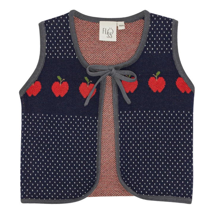 Esther Vest is made from heavy-knitted cotton. Giving comfort and warmth, with tiny dots and an adorable apple print. Featuring contrast edge and strings at front for closure.