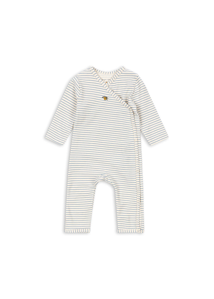 Soft onesie for newborns in a light cotton blend with a hint of stretch. Designed with a wrap closure that features snap buttons along the body and legs for easy dressing.