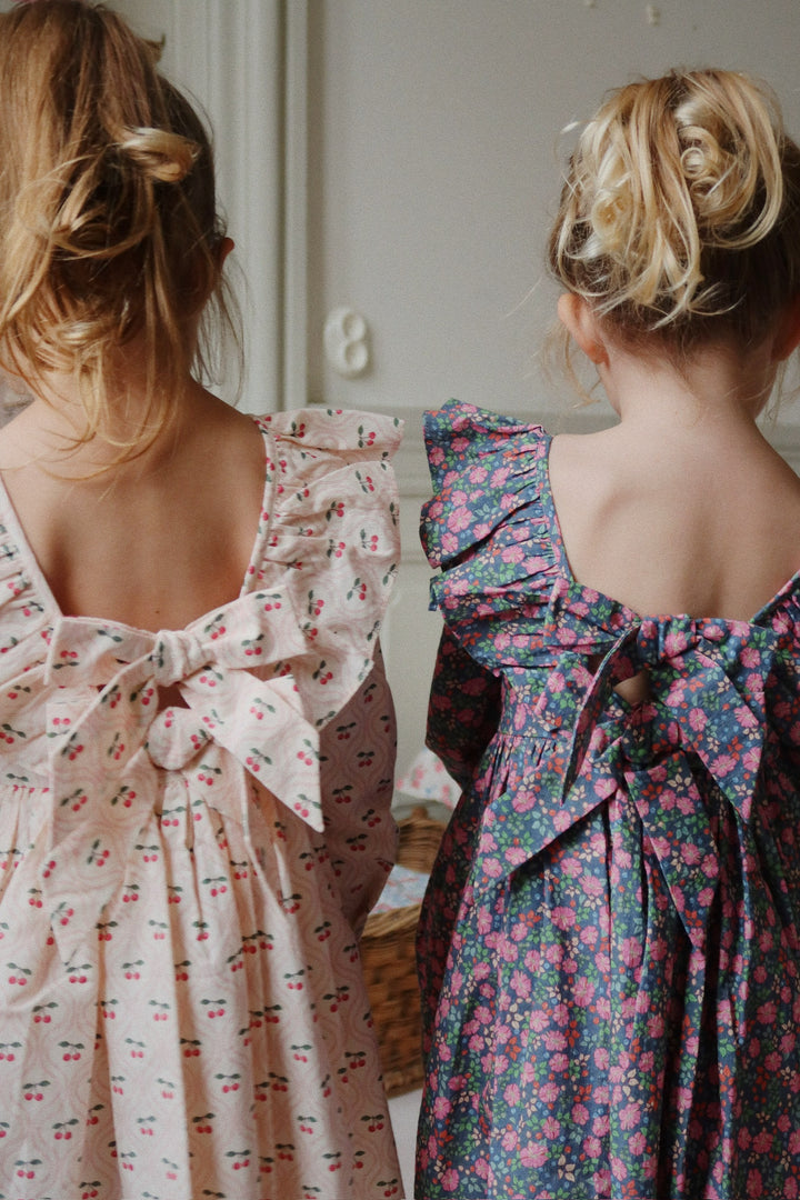 Soft organic cotton dress with frill details at the sleeves and bow details in the back.