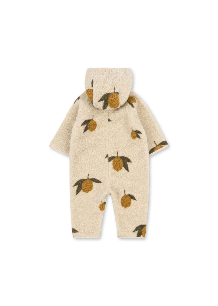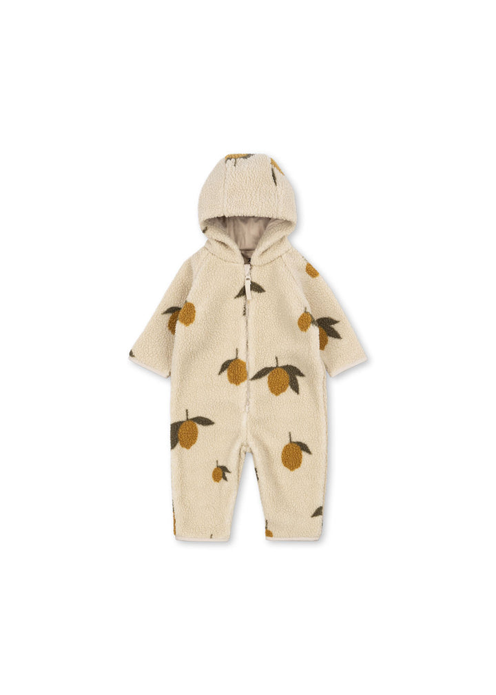 Hooded onesie in our soft and comfortable pile fleece material. Designed with a full front zipper closure and warm inside fleece lining. Ideal as an insulating layer for nap time in the stroller or pram.