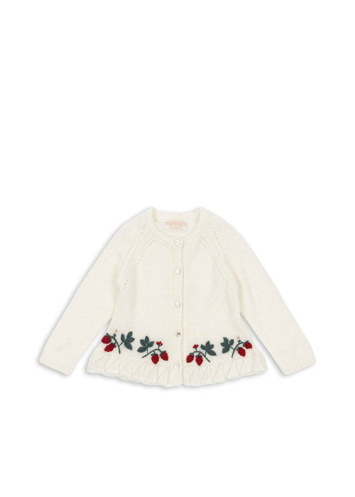 Soft wool blend cardigan finished with a decorative peplum effect, berry embroidery, and mother-of-pearl buttons in front.