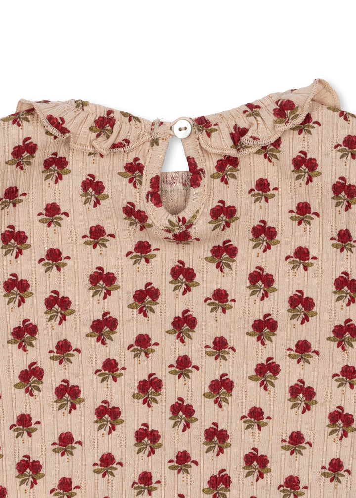 Soft body with a frill collar. Snap buttons at the leg opening for easy dressing.
