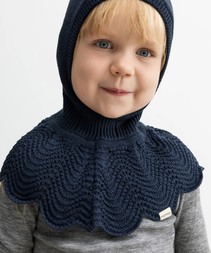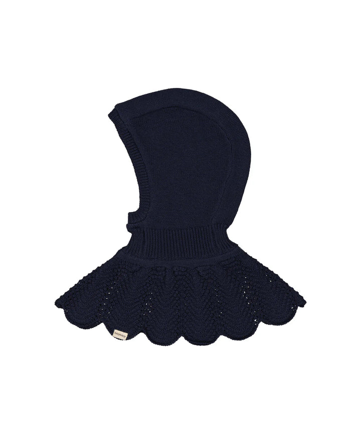 Knitted balaclava that provides optimal protection against the cold by covering both the head, ears and neck while still fitting comfortably close. The balaclava has decorative wavy edges and a lace pattern at the bottom that adds an elegant and feminine touch. The balaclava is soft, warm and perfect for the colder days.
